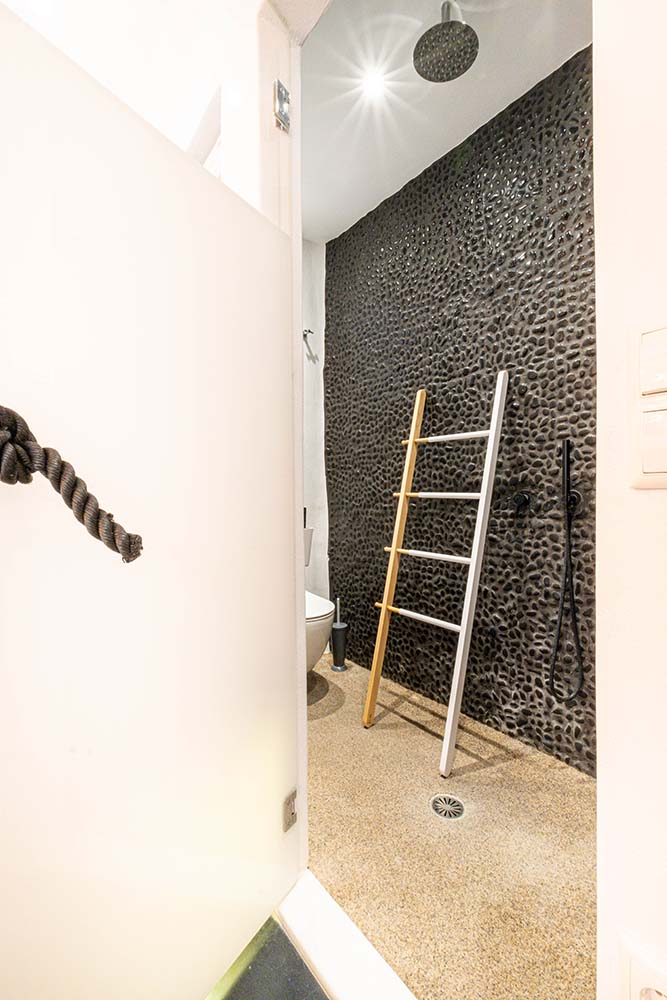 The living room is equipped with a sofa bed that can turn to two single beds and also benefits from a second bathroom.