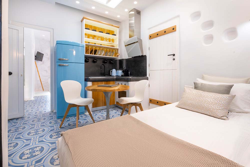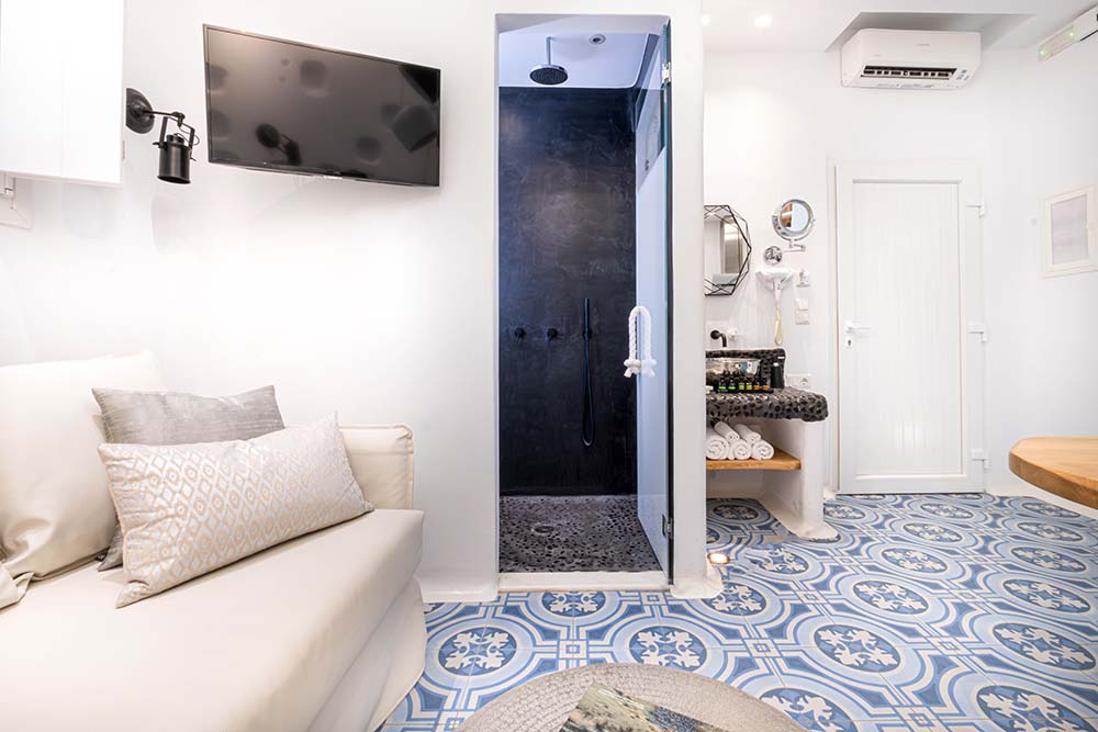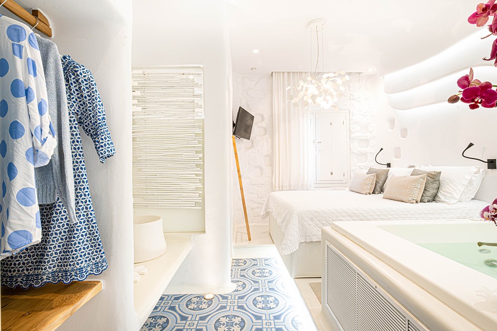 Kyma suite’s unique atmosphere with white and pastel blue tones, outstanding facilities, and its carefully designed lighting create a serene, relaxing vacation experience.