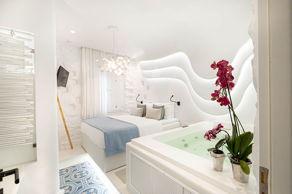 The bedroom with a unique design and the Kyma distinctive element, features a queen double bed, an ensuite shower and a large double jetted tub for moments of endless relaxation.